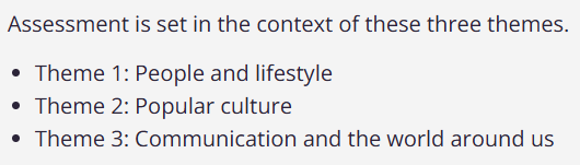 In this period of study, time will be spent on revising each Theme and practising exam skills, with an intensive focus on preparation for the Speaking examination