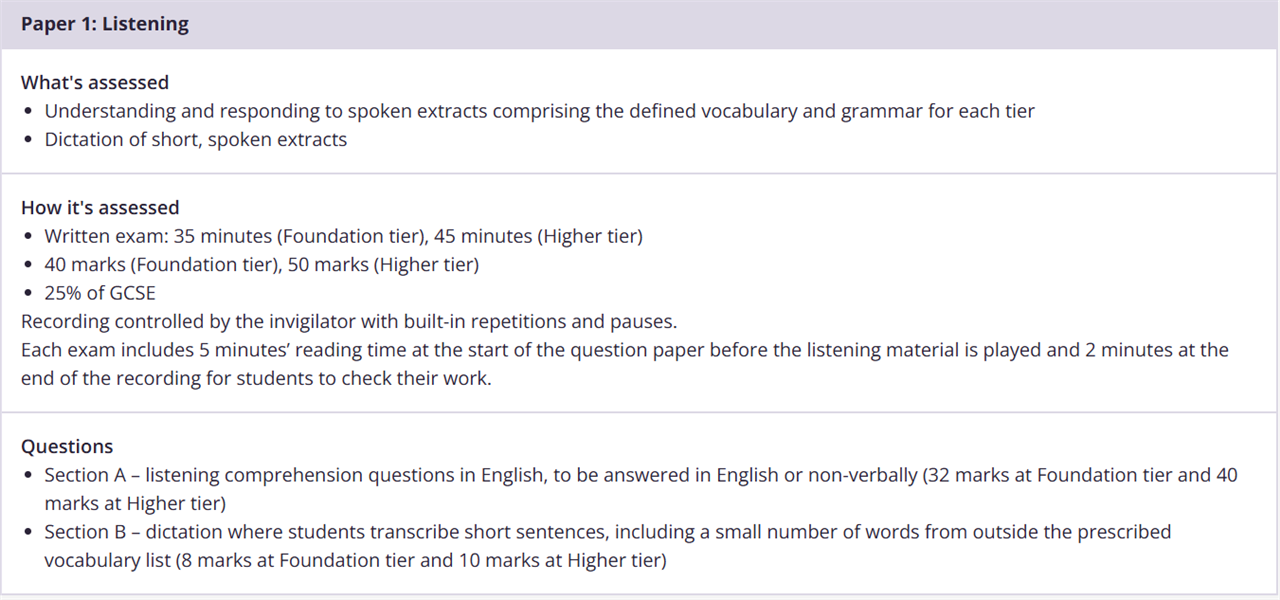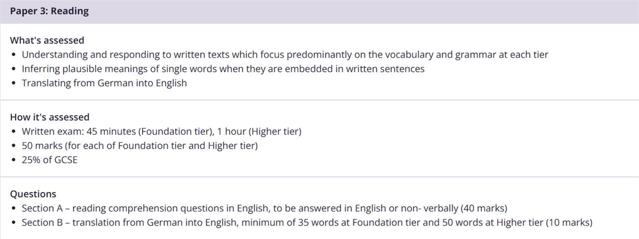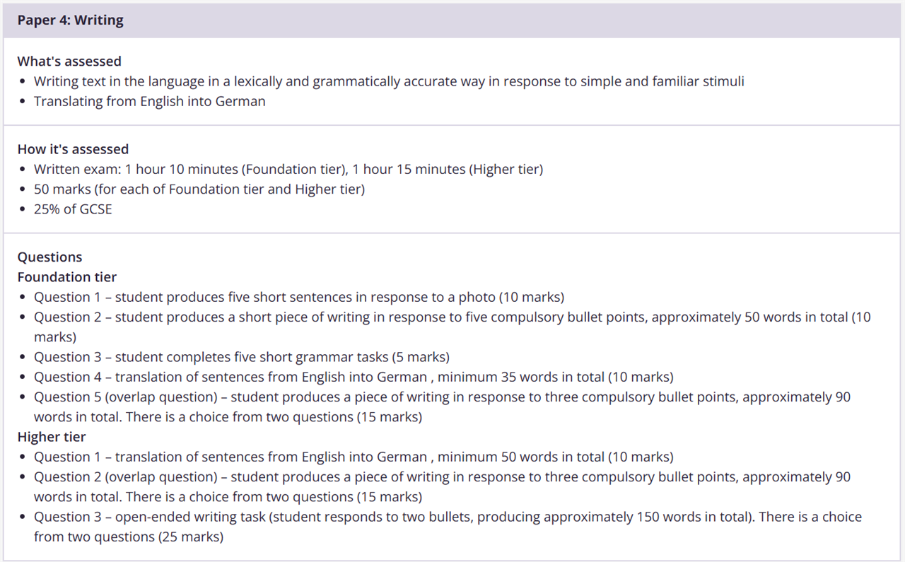 The GCSE course is examined in four skill areas at the end of Year 11, each worth 25% of the overall grade. GCSE German has a Foundation Tier (grades 1–5) and a Higher Tier (grades 4–9). Students must take all four question papers at the same tier.