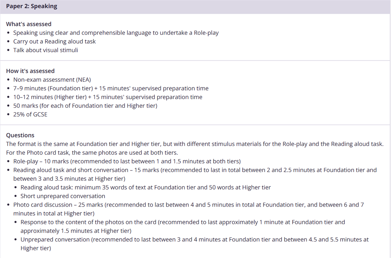 There will be a Mock Speaking Examination, followed by the actual GCSE exams in Speaking, Listening, Reading and Writing - each of which are worth 25% of the final grade.Revision resources