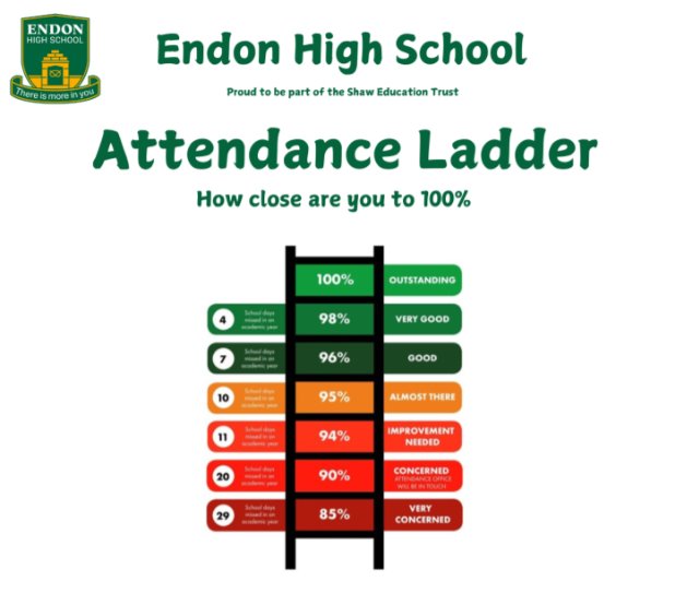 90% in a test at school would be praised. However, 90% attendance = 20 days off school each year, 600 minutes of lost learning each day or 100 hours per year. Over the course of 5 years at Endon high school, your child would have missed 500 hours or 100 days (half a school year).