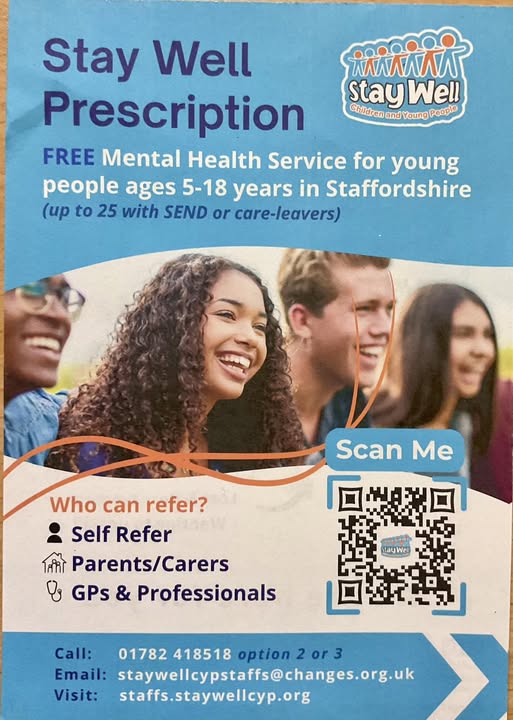 For anyone who would like more information about this free mental health service for young people age 5-18 years in Staffordshire , please scan the QR code , there is also a telephone number, website and email. Pupils and parents can self refer. They offer a wide range of services and help should you need it.