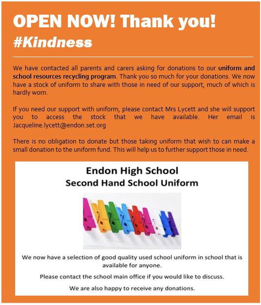 Can parents send in any unwanted uniform to the visitors reception. Recycling uniform helps support the uniform shop.