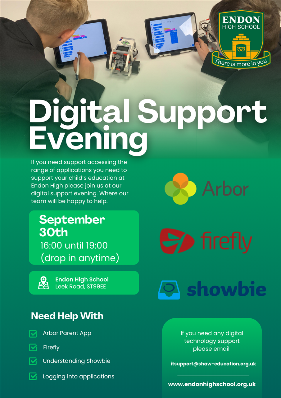 Please share news of our Open Evening and go to our school website for more information. The address is www.endonhighschool.org.uk and click on join our school to find out more.